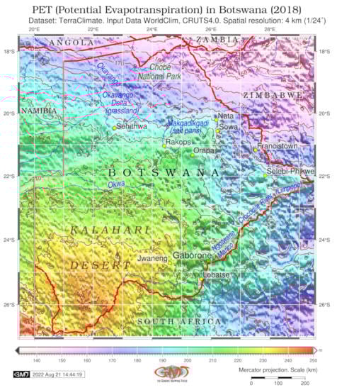 The specific objective was to support the environmental and climate analysis in Botswana through the advanced cartographic visualisation. It involves the analysis of the distribution of temperature extremes in Botswana, occurrence of drought events, variation in the potential and actual evapotranspiration visualised on the maps. The correlations between the soil moisture and precipitation, climate parameters and topographic landforms can be considered for land management [26,27,28,29], crop and vegetation monitoring [30,31], meteorological evaluation [32], nature conservation, and sustainable development in Botswana [33,34]. In light of the above, the focus of the presented research is on the cartographic application of novel programming methods for climate and environmental assessment of Botswana, which includes the following objectives: