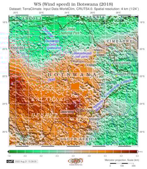 The automated methods and independent modules of GMT were used to process climate data showing mapping climate and environmental variables of Botswana. This included reference to the cartographic workflow of GMT, described in the existing technical literature with examples of using the program [35,36,37,38,39]. Using a scripting approach, this paper presents an alternative cartographic algorithm for the stable and accurate mapping and visualisation of the climate parameters over Botswana in the presence of various nonlinear effects from topography and climate on the environmental setting of the country, following the examples in the existing studies [40,41].