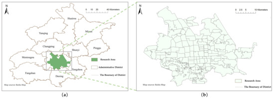 (a) Research area in Beijing; (b) Research Area of the darkened place in (a).