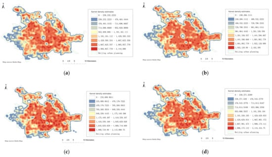 - Shared bicycle data: The shared bicycle data used in this paper is enterprise cooperation data, with the attributes of bicycle ID number, time, and the longitude and latitude of the bicycle. The data collection time interval was 3 h, and these two points of collected data were correlated with the ID number of the bicycle. The starting and ending points of each bicycle were obtained to generate a trajectory. Taking into account the impact of the new crown pneumonia epidemic, the data collection period was from early May to mid-to-late August. During this period, the epidemic situation in various regions of China, especially Beijing, was relatively optimistic, and the impact on travel was small, with residents being more willing to use shared bicycles to travel. Screening the existing data: First, in the existing data, abnormal data (such as rain, high temperature, etc.) were removed. Then, the pre-experiment of the data was carried out. The experimental results show that the distribution of shared bicycles on each weekday or weekend in the same week is basically stable, and the distribution of different weeks shows seasonal fluctuations on a weekly basis. Finally, after excluding the data of abnormal day (such as the day with rain, high temperature, etc.), Among the remaining data of 17 May 2021 to 23 May 2021 is a week with continuous date series and continuous data records, and it conforms to the general rule of bicycle distribution; 17 May to 21 May are weekdays, and 22 May and 23 May are weekends. In order to compare the difference between weekdays and weekends, the working days were divided into three parts for a better analysis of the travel regularities: the period of 17 May, the period of 18 May and the period of 19 to 21 May. We divide the data of weekdays in this way, on the one hand, to make the data of weekdays and weekends continuous, on the other hand, Monday is often the busiest day of the week in China, the regularity of the day is important for the travel pattern analysis of a week. Additionally, the number of data collection intervals on 17 and 18 May are the same, and the number of data collection intervals on 19 and 21 May and 22 to 23 are the same. Because 17:00 and 20:00 are the start and end time of the evening rush hour on weekdays, the data of this period of a day are chosen to show the spatial distribution characteristics of the shared bikes. Meanwhile in order to compare the differences of the distribution of shared bicycles on weekdays and weekends, we chose one day on weekdays and weekends to display the distribution rules of the shared bicycles. The results of the kernel density analysis of shared bicycles’ spatial distribution are shown in the figure below (Figure 2).