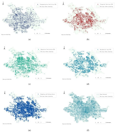 Figure 3. Spatial distribution of data in the research area: (a) POI of transportation facilities; (b) POI of financial services; (c) POI of education institution; (d) POI of residential area; (e) POI of shopping and dining places; (f) Road network in Urban Six Districts of Beijing.