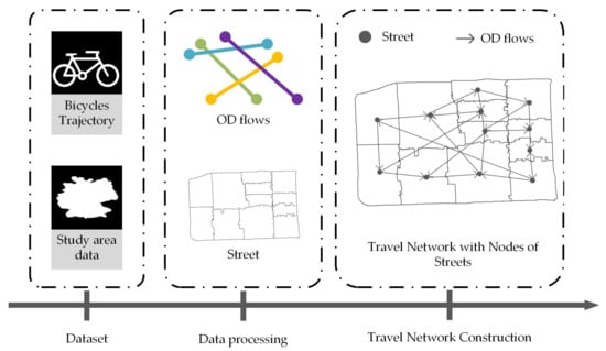 Travel network construction. The data used in this paper include shared bike trajectories and study areas. The OD flows are generated from the shared bicycle trajectory, and the streets in the study area are extracted as network nodes. The location of the start and end points of the OD stream are determined by the location of the block. A travel network is generated with streets as nodes.