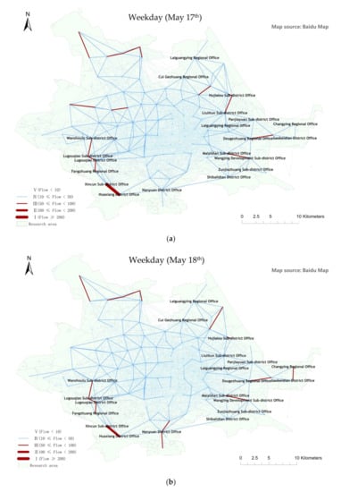 According to the principle of network construction, the shared bicycle travel network is constructed based on data from two different periods. The network has 122 nodes, and each node represents a street block (Figure 5). Figure 5 shows the difference in the network structure between weekdays and weekends, where the flow strength is represented by the color and thickness of the line of the edge: the wider the red line, the larger the flow strength, and a blue line indicates weak flow strength. Table 4 shows the ten travel activities with the highest flow volume on weekdays (19–21 May) and weekends. According to the information in the figure and table, we can summarize the following characteristics of the travel network: