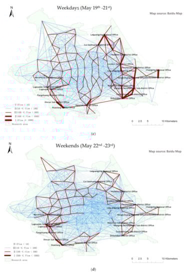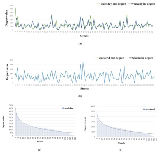 The network structure indicators of weekdays (19–21 May) and weekends are analyzed. From Figure 6, we can conclude that combined with the value of node strength, the in-degree and out-degree have a significant difference on weekdays. Meanwhile, at weekends, the in-degree and out-degree in the same street are close to each other. This verifies the phenomenon that residents have different travel purposes on weekdays and weekends. The purpose of residents’ travels during weekdays is more clear, which results in larger differences in in-degree and out-degree values in some streets (Figure 6a,b). Regardless of the temporal scale, only a few streets have strong node strengths, and most streets have node strengths near the average. The node intensity of most streets on weekdays is between 500 and 2000, and the range of node strength between 500 and 2500 on weekends covers most of the streets. The degree of distribution of all streets is consistent with the power–law distribution, that is, it satisfies the scale-free characteristics of the complex network (Figure 6c,d).