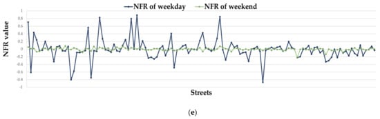 Finally, according to our results, the value of NFR for most streets on weekdays is much larger than on weekends. On weekdays, the NFR of many streets shows large positive and negative values. On the one hand, these streets are hot spots in the network during weekdays, and many people choose to use these streets as the starting point or end of their trip. On the other hand, on weekdays, residents have a clearer potential willingness of travel from streets with negative NFR to streets with positive NFR. The larger the absolute value of the NFR of the street, the more likely the street has a single attribute between employment or residence, that is, the street is an employment area or a residential area. On weekends, the popularity of each street is small, and the NFR always fluctuates around the 0 mark, because the inflow and outflow of each street block are roughly equal. Additionally, it shows that over the weekend, all street blocks interact with each other, and the volume of travel flow is also larger (see Figure 6).