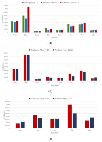 This paper compares and analyzes the influencing factors of working days (19th–21st) and weekends (Figure 7b,c). From the aspects of temporal analysis, comparing the coefficients of various factors on weekdays and weekends, it can be concluded that the coefficients of Bden, Price, and Res reach the same peak in the two periods, indicating that these factors are effective for people traveling between streets in either part of the week (Figure 7b). The remaining five coefficients are Eco, Rden, Tra, SaC and Edu. From the weekday results, it can be seen that the coefficient of the financial service factor is larger than the coefficients of the other four factors (Figure 7c). Financial service facilities are used to measure the financial service capacity of the street, which can reflect the economic development level of the street to a certain extent, and are the most important factor to distinguish between weekends and weekdays. The more convenient the financial services of the street, the more shared bicycle flow can be generated on weekdays. From the weekend estimation results, it can be seen that the coefficients of the above five influencing factors are almost the same. The formation of the shared bicycle travel network is the result of a combination of many factors. A person’s choice to use a shared bicycles to reach their destination is always made according to their own needs.