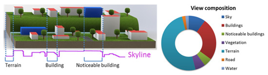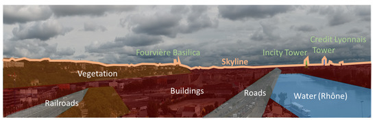 Thanks to geometry and semantics, city view composition studies can be conducted. Figure 1 illustrates this purpose with a view of Lyon (France). Landscape analysis can provide additional information, such as vegetation composition [5] and the location of significant buildings or roads [13,14,15].