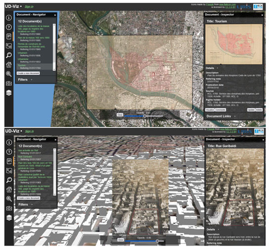 - Jaillot, V.; Rigolle, V.; Servigne, S.; Samuel, J.; Gesquière, G. Integrating multimedia documents and time-evolving 3D city models for web visualization and navigation. Trans. GIS 2021, 25, 1419–1438. [Google Scholar] [CrossRef]