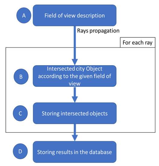 Composition of the 3D view in four steps: Field of View Description (Step A), Intersecting Objects in the 3D Scene (Step B), Storing intersected objects (Step C) and Storing results in the database (Step D).