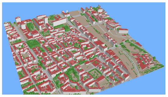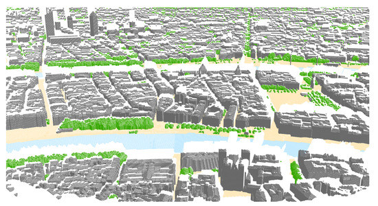 Currently, 3D city models may cover several hundred square kilometers, and numerous objects and polygons must, therefore, be tested for intersection computations. For example, the Lyon open data in France (https://data.grandlyon.com/, (accessed on 7 September 2022)) provides a territory of 550 sq km (an example of 1 × 1 km of Lyon is shown in Figure 6). Table 1 shows the number of triangles regarding the four different kinds of objects (buildings, roads, terrain and vegetation). Due to the density (urban, peri-urban or rural areas), the number of triangles may also evolve for these kinds of objects.