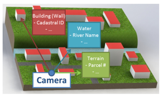 With the previously depicted discretization process, it is possible to obtain a set of rays. Each ray will be propagated from the viewpoint to the 3D scene and maintain the RGB value of the intersected object (this is a well-known process used in rendering pipelines, commonly named ray tracing). In our case, we must bear in mind that the semantic part of the data or the distance between the viewpoint and the object are of interest. The diagram in Figure 7 illustrates our purpose; three rays intersect different kinds of objects in a simplified view. For instance, the red one intersects a building; the distance or color of the object, and linked information given by attributes, are stored for this ray. Rays with no intersection are classified as out of scope (two cases remain: the intersection is out of the territory bounds (will be detected later) or in intersection with the sky).