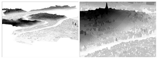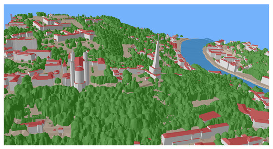 In our case study on the metropolis of Lyon (>550 sq km), using the visibility analysis tool of a common GIS software program (ESRI ArcGIS (http://www.esri.com/arcgis/about-arcgis (accessed on 7 September 2022))), we could only perform a 2.5D visibility analysis on a 1-m-resolution DEM, covering 48 sq km (only the City of Lyon). Figure 12 shows how the urban morphology is rendered through a 1-m-resolution raster DEM, while Figure 13 makes it possible to visually compare the representation of a given area through a 1-m raster DEM and a 3D vector model. This sheds light on the crucial importance of the processing of 3D vector data, as offered by our tool, so as to use the most precise description of building shapes input and to be able to take into account the masking effects of vegetation. Currently, the existing 2.5D raster analysis performed on raster data limited in size (by machine and/or software limitations) simplifies the geometry of the vegetation and buildings when carried out in large areas (districts, cities, metropolis, etc.). On very large scales (metropolis, region, etc.), 2.5D raster data can hardly even take into account the geometry of built structures, let alone the masking effects of vegetation. In our work on the landscape of the metropolis of Lyon with ArcGIS, we had to downsize our DEM to a resolution of 25 m or work on a larger area than the city itself (70,000 sq km) (the analysis of such a large area was interesting as the work on landscape composition included distant mountains visible in specific meteorological conditions (in our case, the visibility of Mont Blanc from the city center of Lyon)).