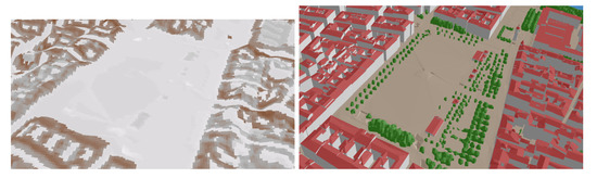 Visual comparison between data describing the same location (Bellecour square): raster data (1-m DEM—left) and 3D vector data (right).