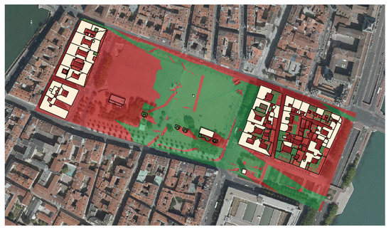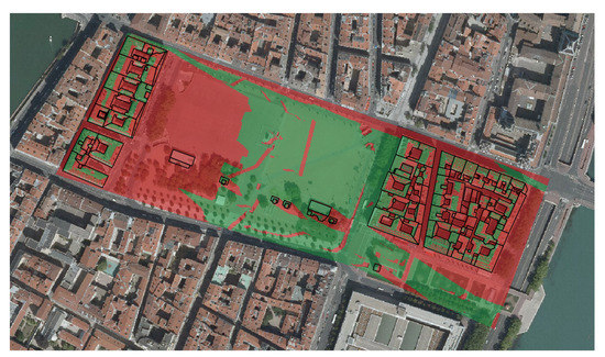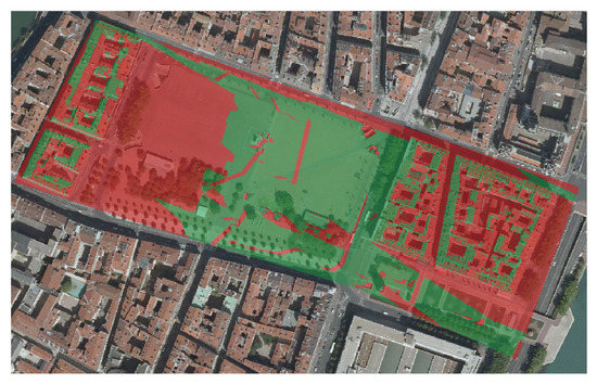 Raster analysis results regarding the visibility of the Fourvière Basilica (Bellecour Square). Green pixels indicate that the Basilica is seen, and red pixels that it is not seen. The results are displayed on an aerial image of the square; hence transparency is used.