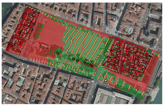Same as Figure 16, with the addition of the visibility analysis from our tool (in green, vegetation; in yellow, terrain; in red, roofs; in white, building’s walls).