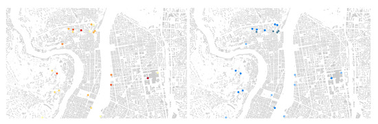Visualization of vantage points (each point is a vantage point). On the (left), the number of landmarks seen from the vantage points (from red, five landmarks seen, to yellow, zero landmarks seen). On the (right), effort needed to access the vantage point on foot, in calories (from light blue (less than 20 calories) to dark blue (more than 70 calories).