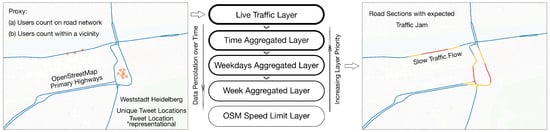 The authors have conceptualised five different temporal resolutions for current analysis (cf. Figure 1): Live Traffic layer> Time Aggregated layer > Weekday Aggregated layer > Week Aggregated layer > OSM Speed Limit layer. The Live Traffic layer holds traffic predictions made using the near-real-time social media data, along with other feature spaces. As soon as this particular layer becomes outdated it will update all underlying layers, except for the OSM Speed Limit layer. The Time Aggregated layer contains the traffic status of pre-defined time-bins to reflect office commute hours. The Weekdays Aggregated layer represents the traffic status aggregated over the last four weekdays—for example, by aggregating the traffic status of the region by aggregating the last four Mondays if the user is requesting Monday traffic information. Similarly, the Week Aggregated layer holds traffic value by aggregating the data of the last seven days, considering all time-bins. Furthermore, finally, if for a given region no information is available from any of the above layers the OSM Speed Limit layer is used to return the highway maximum speed limit. This traffic layer stack thus would ensure that the user receives at least some information for the requested road segment, with the highest weighting given to the Live Traffic layer and descending weight towards the OSM Speed Limit layer. The overall traffic prediction would be a weighted average of all these layers.