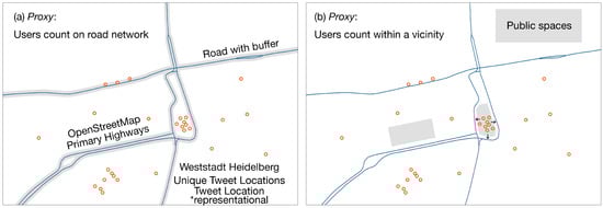A sample street network in the city of Heidelberg, Germany, showing (a) how geo-tagged tweets were selected based on the buffer around the highways for the “User count on a road segment” proxy, and (b) how a geo-tagged tweet cluster in a public space was used for the “User count within a vicinity” proxy.