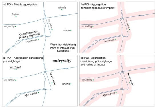 The figure shows four ways to aggregate land-use and land-cover POI data for a given tile. For (a), a simple counting of all POIs in an area of interest is performed. In (b) a pre-defined road buffer, per different highway type, is used to select only nearby POIs before counting. In (c) pre-defined weights, according to the importance of the infrastructure, are used while counting, and in (d) a pre-defined road buffer, per different highway type, in addition to weighting is used to select and prioritise only nearby POIs before counting.