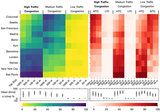 While the prediction for high traffic congestion was almost balanced for the combination of all cities, the predictions for the individual cities were unbalanced (cf. Figure 6 and Figure 7). Cincinnati was almost completely no-HTC-labelled and Sao Paulo was almost completely HTC-labelled for the 500 and 100 m tile size. Kyiv, on the other hand, showed a more balanced distribution of HTC and no-HTC tile locations at the 1000 m and also at the 500 m tile size. It is interesting to note that cities that showed more high traffic congestion if the Uber data had a higher prediction accuracy. A more realistic approach, therefore, would be to consider all tiles from different cities to cancel out the extreme effect of this imbalance, although all cities were also independently inspected for training.