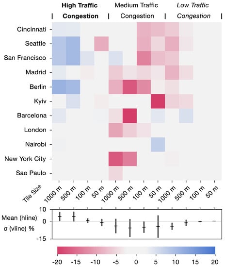 Uber is a mobility service provider, which has recently started providing urban vehicle speed data under the Creative Commons Attribution Non-Commercial License [35]. The authors used it to identify highly traffic-congested road segments in the selected cities. The data come with an OSM highway id as a foreign key that allows matching it to the corresponding OSM road network. Uber provides vehicle speed data for segments of OSM road objects. The road segments are defined by specifying the OSM-id of the start and the end of the segment. In addition, the driving direction is indicated. For the selected cities, average movement speeds differed, being between 27.0 km/h for Sao Paulo and 51.5 km/h for Cincinnati (cf. Table 3).