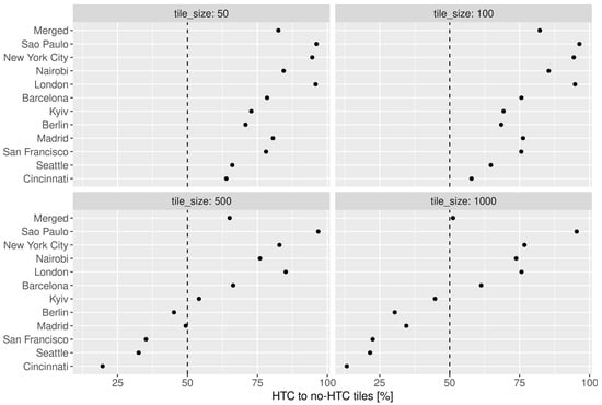 Degree of class imbalance in HTC vs. no-HTC labels per each dataset based on the Uber data (static class definitions). All instances with at least one empty feature space have been discarded. The x-axis shows the relationship between the number of HTC to no-HTC tiles per city for the different tile sizes. A value of 50% indicates perfectly balanced data. “Merged” represents the combination of all eleven cities.