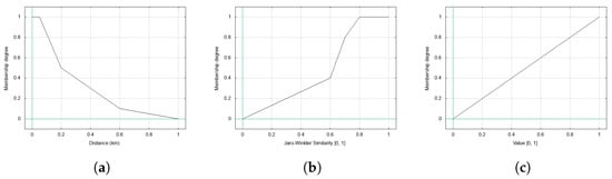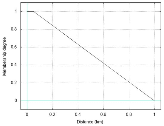 Given two pairs of coordinates, i.e., and (denoting latitude and longitude of two points on the earth globe), the function computes the “Geodesic Distance” [] between the two points in km; it is denoted as . On this basis, it is possible to define the membership function that, given a distance (in km) determines whether the distance denotes that two points are close; it is denoted as ; an example of a typical membership function for this concept (the same exploited in []) is depicted in Figure 2: notice that, on the basis of the geodesic distance between the two points, the membership degree is 1 when the distance is between 0 and 50 m; then, it linearly decreases from 50 up to 1000 m. In Section 6.2, we will define a more sophisticated membership function.