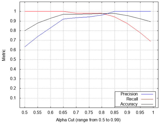 Then, we run the script on these two reduced collections of descriptors. Table 1 reports the results of our experiments. Specifically, the first colum reports the single values for the alpha-cut ; the second and third columns report the number of relevant pairs saved by line 7 of the J-CO-QL script (Listing 3) into the RelevantPairs collection and the number of pairs generated by line 12 of the script (Listing 4) and saved into the SamePlaces collection, respectively. The, columns from 4 to 7 reports the number of true positive pairs, the number of negative pairs, the number of false positive pairs and the number of false negative pairs, respectively. Finally, the last three columns reports “Precision” (defined as ), “Recall” (defined as ) and “Accuracy” (defined as ), respectively. These three latter values are depicted in Figure 10: the x-axis reports the values of the alpha-cut parameter; precision is depicted by the blue line, recall is depicted by the red line and accuracy is depicted by the black line.
