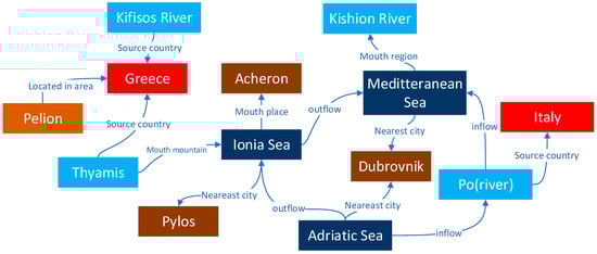 A knowledge graph (KG) contains rich descriptions of concepts, objects/places, events, and their relations in the physical world in the form of symbols. As shown in Figure 1, for example, the triplet <Ionian Sea, outflow, Meditteranean Sea>. A geographic knowledge graph (GeoKG) provides a convenient tool in the field of geography to describe geographic knowledge, depict the relations between objects, and express geographic information. Among the components of a GeoKG, a geographic entity (geo-entity from hereon) represents an object with location connotation in the real world. A geographic relation (geo-relations from hereon) refers to the relation between geo-entities and related entities, mainly including their spatial (e.g., spatial adjacency, separation, orientation, and inclusion relation) relation and semantic (e.g., type, component) relation [1]. The vast amount of ubiquitous geographic semantic information present on the Internet promotes GeoKG-related research, including geographic information extraction [2], geographic information fusion [3], GeoKG construction [4,5], and GeoKG reasoning [6]. High-quality entities and relations are important prerequisites for intelligent computation and reasoning based on a KG, such as recalibration convolutional networks for learning interaction KG embedding, learning KG embedding with heterogeneous relation attention networks, and multi-scale dynamic convolutional networks for KG embedding. However, owing to the constraints of ambiguous semantics, variety of styles, and incomplete structures of natural language expressions, the existing geography-related knowledge bases (e.g., DBpedia [7], Ownthink, OSM [8], and Geonames [9]) do not only contain massive geo-entities but also have sparse entity relations and are generally missing data. This results in an incomplete relation structure, inaccurate information, or poor timeliness, which seriously affects the intelligent reasoning and computation of the resultant GeoKG [10]. Hence, geo-relation complementation has become the primary challenge of GeoKG research.
