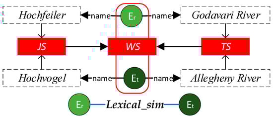 First of all, for the set of attribute names obtained for , Equations (1)–(3) are used to calculate the lexical similarity of the entity attribute names and obtain the set of aligned attribute names ; and then the proportion of attribute type alignment is calculated (Equation (7)).