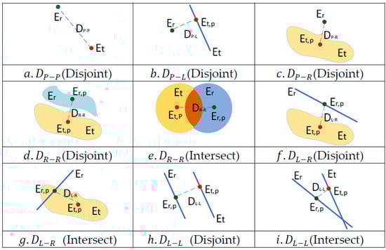 Thus, the first function of “spatial_sim” in Figure 2 is to recognize geo-entities as an appropriate geo-object type (e.g., Point, Region, Line). After the identification of the corresponding geometric object types of the geo-entities involved in the spatial similarity calculation, a computing framework in Table 1 is used to obtain the similarity computing mode of the given entity. The spatial similarity calculation framework of geo-entities is shown in Table 1, in which represents the spatial distance model of two geo-entities. The spatial distance calculations between different geo-object types with different topological relations have different patterns. The Point–Point type does not have the topological relations including “Intersect”, “Contains“ or “Within”. The Point–Line type does not have the topological relations including “Intersect” or ”Equation”. The spatial distance is often zero when the two geo-entities are of the Point–Line or Point–Region type. This is also the case for Line–Region or Line–Line types with topological relation “Contains” or “Within” as well as in the Point–Point, Point–Region, or Line–Line types with the topological relation “Equation”.