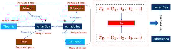 The types of connected entities in a GeoKG can partly reflect the potential similarities between geo-entities. As shown in Figure 2 and Figure 5, the entity types adjacent to the geo-entities “Ionian Sea” () and “Adriatic Sea” () include {“body of stream”, “body of water”, and “populated place”} (), indicating a high structural similarity between them.