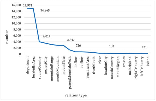 Details of the geo-relations in the GeoDBpedia21 dataset are shown in Figure 7, in which there is an unbalanced distribution of relation types; the relations “department”(14,974), “located in area”(14,865), and “source country” (4012) appear the most, and several geo-relations appear less than 1000 times (e.g., “inflow”, “outflow”, “broadcast area”, “river mouth”, “river”, “location city”, “south country”, “mouth region”, “crosses”, “major island”, “right tributary”, “left tributary” and “island”).