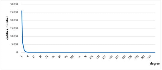 Details of the geo-entities in the GeoDBpedia21 dataset are shown in Figure 8; 25,872 geo-entities have just one degree, which represents the number of other geo-entities connected to the given entity from a KG aspect, as well as the number of edges connected with this node from a graphical aspect. Most geo-entities have a degree < 8, and the number of geo-entities varies from 10 to 1 when the degree is >20. Thus, unbalanced distribution of geo-relations and weak connectivity between geo-entities Objectively exists in the GeoDBpedia21 dataset. A similar pattern is expected for large-scale GeoKG whose data are from complex Internet resources. This unbalanced distribution of relations is visualized in Figure 9, where it can be seen that many geo-entities have little connection to other geo-entities around the boundary in the graph.