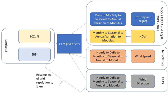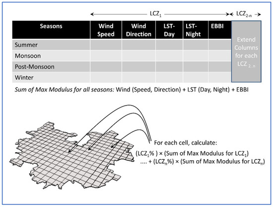 Next, we ranked the grid cells according to the modulus variation of each parameter within them. In the case of a grid cell with the maximum modulus (seasonal and annual variation) of daytime LST, the value assigned to it would be 1, and if it was not that cell, the value assigned to the grid would be 0. Using this method, the annual and seasonal modulus values for each parameter were compared with each other, for each grid cell. During the final rank derivation, summation values for each of the LCZs obtained in the previous steps were used as weights. These were calculated by multiplying the LCZ proportions within each grid cell by these weights and adding them together. Our final output consisted of calculating the causal factor variability of each 1 × 1 km grid cell by rescaling the values obtained to 100. The assumption was that those cells with greater variability should be monitored more closely, with a greater distribution of sensors, than those with less variation (Figure 3).