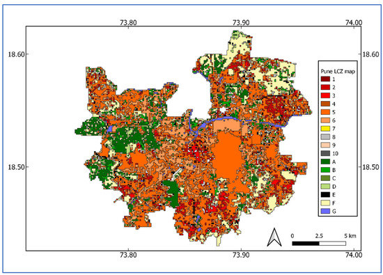 An LCZ classification was carried out based on the WUDAPT approach, as mentioned in the data pre-processing section, and an LCZ map was plotted for Pune, as shown in Figure 4. Pune city is dominated by an open midrise zone (LCZ 5). It is present in the cantonment area, which can be observed on the east side of the city center. The central area of the city has both open midrise (LCZ 5) and open lowrise (LCZ 6) zones. Occasionally, one can observe clusters of lightweight lowrises (LCZ 7). The eastern peripheral region of the city has a lot of open and barren area, classified as LCZ F. On the other hand, a few areas still have a good amount of vegetation, represented by LCZ A, such as that observed in the southern and western parts of the city. There are two rivers that merge to flow east near the city center.