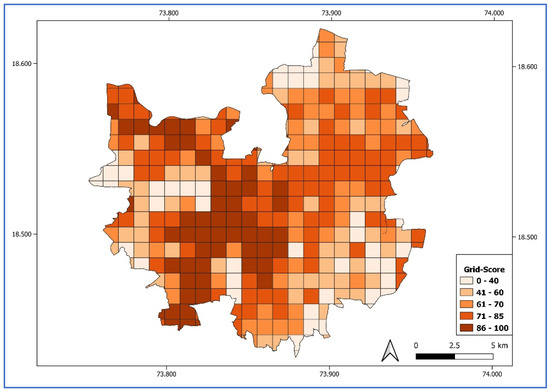 A map, whereby each grid is given a rank between 0 and 100, was the major output of this study. It shows areas with minimum to maximum variability in LST and wind, along with the bareness index and the proportion of LCZs associated with it (see Figure 5; for more details, refer to Figure 3 and Table 3). Thus, a score closer to 100 indicates those cells with a high variability in LST and wind at the seasonal and annual levels, as well as those that have a higher proportion of LCZs and vegetation, and the bareness conditions responsible for the variability. Therefore, it is recommended that these areas should be prioritized for sensor placement, whereas values closer to zero indicate cells with low variability in LST and the conditions responsible for it, suggesting that the density of sensors could be lower.