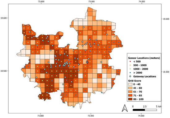 Furthermore, modern sensor technology often uses radio signals (e.g., low-power wide-area networking, or LoRaWAN) to transmit data to a centralized server. This requires the installation of specialized gateways within a certain distance (e.g., 500 m) of the sensors. Based on the number of sensors and the gateway availability, the distribution per category may change, even when using the same method. The output of this method was visualized by overlaying the gateway locations and public buildings onto the ranked grids. Figure 6 depicts the locations that were identified for the installation of gateways. Government buildings such as hospitals, government offices, and schools were identified in various grids because these may be ideal locations for gateway installation and sensor placement. The cells in which sensors can be placed, based on the distance of the gateway, are indicated using the color-coded circles in the grids for the shortest distances from the identified government buildings or the closest gateway location. We should note that some grid cells with low scores have no locations identified where gateways could be placed; however, the lack of gateways in this area is acceptable given that these regions do not have a high variability in the UHI_CL, and thus sensors need not be placed there.