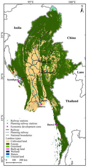 The study area showing land use distribution, existing railways and railway stations, planning railways, railway stations, and SEZs in Myanmar.