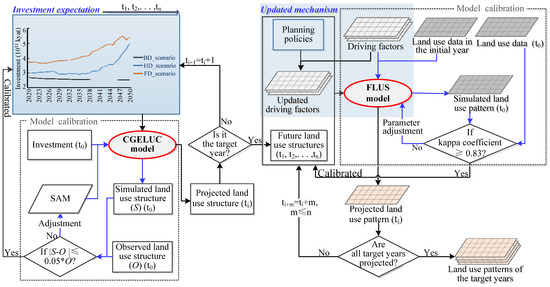 Schematic framework of the proposed coupling model of CGELUC and FLUS. The blue arrows describe the flows of model calibration for the CGELUC and FLUS models, and the black arrows demonstrate the flow of land use projection.