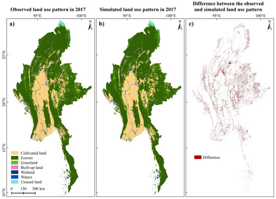 Distributions of the (a) observed and (b) simulated land use patterns in 2017 and the (c) difference between them.
