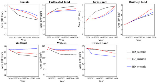 The cultivated land, grassland, and built-up land gradually expand at the expense of the forests from 2017 to 2050 under the three scenarios (Figure 6). The reductions of forests in the HD_scenario are obviously less than those in the BD_scenario and FD_scenario. The largest increase of cultivated land is found under the BD_scenario for the high dependence on agriculture. From 2017 to 2050, the scales of the occupied grassland under the FD_scenario, HD_scenario, and BD_scenario increase by 27,048.05 km2, 22,290.69 km2, and 26,584.11 km2, respectively. In the FD_scenario, the built-up land exhibits a fast growth to more than 5000 km2 by 2050, nearly tripling the amount in 2017. The smallest increment of built-up land is witnessed from 2017 to 2050 under the BD_scenario (2222.69 km2), indicating a decrease in the competitive advantage of built-up land. The wetland increases slightly under the HD_scenario, but it remains decreased under the other two scenarios. The unused land tends to decrease in the three scenarios, exhibiting the largest reduction in the HD_scenario. In summary, the demands of built-up land and cultivated land increase continually under all scenarios. Meanwhile, the wetland and forests are shrinking, suggesting that the eco-environment in Myanmar will worsen.