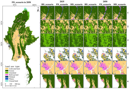 The succession of land use patterns in Myanmar shows overall consistency and local differences in all scenarios (Figure 7). The global spatial patterns of the projected results in the three scenarios are in accordance with those in 2017 (see Figure S1). The cultivated land is mainly distributed in flat areas, such as central and southern Myanmar. In addition, some cultivated land areas are distributed in mountainous areas of eastern Myanmar. The forest area is mainly concentrated in mountainous areas of Myanmar. The built-up land exhibits a characteristic of local agglomeration in metropolis (i.e., Mandalay and Yangon) and mining areas. The local characteristics of land use development under the three scenarios in 2035 and 2050 are different. Compared with the HD_scenario, the land use patterns in the BD_scenario and FD_scenario exhibit several characteristics. First, the cultivated land and grassland invade more forests and wetland, especially in mountainous areas of eastern Myanmar. Second, built-up land increasingly occupies more cultivated land and forests around the urban areas and mining areas, respectively. Third, forest area maintains less diversity in land use patterns in the intersection of forests, cultivated land, and grassland. Few and dispersed changes in wetland, waters, and unused land are observed, exhibiting an unapparent spatial characteristic.