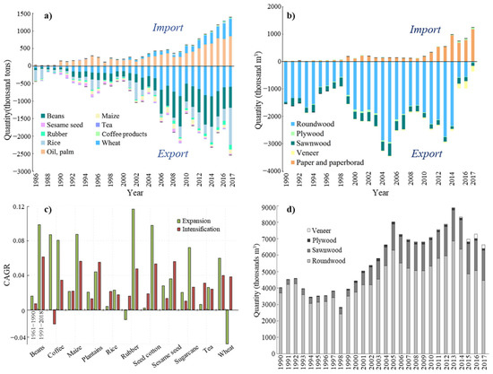 Production and trade of agricultural and forest products in Myanmar. (a) Import and export of agricultural products between 1986 and 2017, (b) import and export of forest products between 1990 and 2017, (c) compound annual growth rate of expansion and intensification for the main crops in Myanmar during the periods of 1961–1990 and 1991–2018, (d) volume of the main four forest products annually produced in Myanmar between 1990 and 2017. These historical data are acquired from the Food and Agriculture Organization (http://faostat.fao.org/ (accessed on 25 June 2021)).