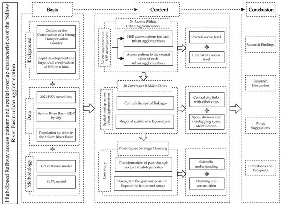 In the past 20 years, promoted by policies such as Central Rise and Western Development, the Yellow River Basin has roughly nurtured or formed seven urban agglomerations. However, due to the development foundation and natural conditions, the development of the Yellow River Basin is relatively lagging behind [1]. As a complex territorial system in the advanced stage of urbanization development, urban agglomerations are both the main spatial carriers for national participation in the international division of labor and global competition, and they are important territorial units for new urbanization and economic development [2,3]. Along with the introduction of the strategy of high-quality development, and the important instruction of General Secretary Xi Jinping on “promoting the formation of a regional economic layout with complementary high-quality development”, the latest deployment of the coordinated development of north–south and east–west complementary regions has given the Yellow River Basin a great development opportunity [4,5]. Transportation was the basis of regional spatial interaction in the Yellow River Basin, and a well-developed transportation network can strengthen the connection between nodes, reinforce the interaction between the central place and the surrounding cities, promote the functional division of labor in the regional town system, and increase the trend of urban agglomeration integration and scale effect expansion, which are prerequisites for high-quality regional development [6]. However, the natural lack of river navigation benefits in the Yellow River Basin [7] hinders the formation of a transportation artery across the entire region, requiring integrated land transportation to assume more urban–regional spatial linkages. In 2019, the State Council of the Central Committee of the Communist Party of China issued the “outline of the construction of a strong transportation country” [8], which pointed out that, at this stage, the overall goal of building a strong transportation country should be built around the “National 123 Travel Traffic Circle”, putting forward new requirements for the traffic access pattern. As an important part of comprehensive transportation, high-speed railway (HSR) travel time is of great significance to regional development.