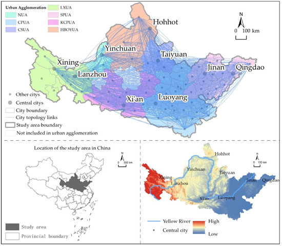 The Yellow River flows from west to east through seven urban agglomerations, namely, the Lanzhou–Xining Urban Agglomeration (LXUA), Ningxia Urban Agglomeration (NUA), Kuan-Chung Plain Urban Agglomeration (KCPUA), Hohhot–Baotou–Ordos–Yulin Urban Agglomeration (HBOYUA), Central Plains Urban Agglomeration (CPUA), Central Shanxi Urban Agglomeration (CSUA), and Shandong Peninsula Urban Agglomeration (SPUA), with reference to the planning texts of the Lanzhou–Xining Urban Agglomeration Development Plan, Kuan-Chung Plain Urban Agglomeration Development Plan, Hohhot–Baotou–Ordos–Yulin Urban Agglomeration Development Plan, Central Plains Urban Agglomeration Development Plan, and Shandong Peninsula Urban Agglomeration Development Plan (2021–2035), containing a total of 76 cities (Figure 2). LXUA is in the upper reaches of the Yellow River and consists of Lanzhou and Xining as a regional twin center, radiating the development of both the Gansu and Qinghai regions. NUA, HBOYUA, and CSUA are in the upper reaches of the Yellow River “Jiziwan”, consisting of five provinces: Gansu, Ningxia, Inner Mongolia, Shaanxi, and Shanxi. KCPUA is led by Xi’an, the western growth pole, to drive the common development of 10 cities in Shaanxi, Shanxi, and Gansu Provinces. The CPUA is one of the cores of the regional development of the middle reaches of the Yellow River, located in an excellent location featuring a combination of coastal areas and central and western regions, forming a regional development pattern that includes 30 prefecture-level cities in Henan, Hebei, Shanxi, and Anhui Provinces. SPUA is the only urban agglomeration in the lower reaches of the Yellow River, located between the Beijing–Tianjin–Hebei Urban Agglomeration and Yangtze River Delta Urban Agglomeration, communicating the vast hinterland of the Yellow River Basin.