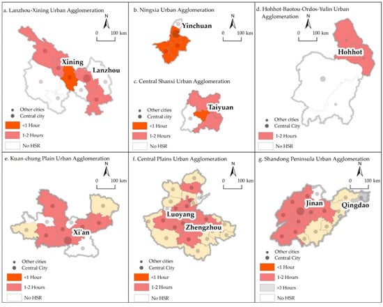 In the “outline of the construction of a strong transportation country”, it was proposed to build a convenient and smooth transportation network for urban agglomeration and to form a 2 h access transportation pattern for urban agglomerations. It was shown that the 2 h access range of urban agglomerations is the limit of travel time tolerated for commuting in general [46], and an efficient and fast transportation network can enhance regional connectivity and enable different cities to strengthen communication links, as well as interactions, generating network externalities and, thus, promoting the optimal development of urban agglomerations. Therefore, this study analyzed the overall pattern characteristics of the travel traffic circle of seven urban agglomerations in the Yellow River Basin through the travel access time of each city by HSR, and then comparatively evaluated each urban agglomeration according to the 2 h access standard of urban agglomerations in the “outline of the construction of a strong transportation country”.