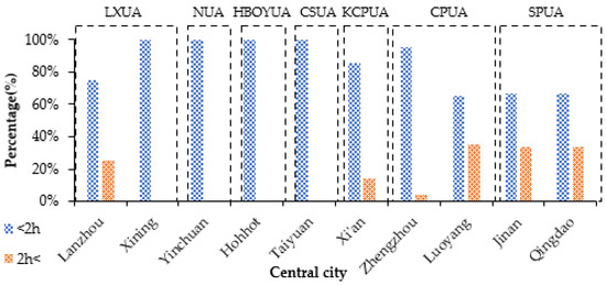 Comparing the 2 h HSR travel coverage of central cities in each urban agglomeration (Figure 5), when the central city was closer to the geometric center of the urban agglomeration, the HSR travel time for the central city to reach other points in the urban agglomeration was generally lower, and it was easier to expand the scope of its travel traffic circle. Central cities of SCUA and CPUA, Taiyuan and Xi’an, were located in the center of the urban agglomeration, and their location largely affected the size of their 2 h HSR travel traffic circle, with the two central cities covering a higher proportion of the 2 h HSR travel traffic circle, demonstrating stronger accessibility. There was a large difference in the value of the coverage ratio of the 2 h HSR travel circle between the central cities of LXUA, with Lanzhou covering 75% and Xining covering 100%, a 1.3-fold difference. The proportion of the area covered by the 2 h HSR travel traffic circle in CPUA, that of Zhengzhou (96%), was 1.5-fold larger than that of Luoyang (65%), and revealed the most extreme difference. The area covered by the 2 h HSR travel traffic circle of Jinan and Qingdao, the central cities of SPUA, was the same, indicating that the two central cities were balanced in terms of the proximity of HSR connections and the effect of radiation diffusion on other node cities in the region. It should be noted that the spatial interpolation is not visualized for NUA and HBOYUA in Figure 4, since the spatial interpolation effect was not significant due to the low development of HSR within these two urban agglomerations and the few cities reached by HSR.