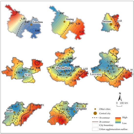 Central cities can lead the overall development of urban agglomerations and generate functional spillover effects, while acting as regional transportation hubs, which can promote integrated development with neighboring cities and realize the transformation from an “urban gateway” to an “urban living room”, whereby central cities and urban agglomerations become the main spatial forms for carrying development factors [32]. With reference to the development plan of each urban agglomeration and the provincial “14th Five-Year Plan”, the central cities of LXUA were Lanzhou and Xining, the central city of NUA was Yinchuan, the central city of CSUA was Taiyuan, the central city of HBOYUA was Hohhot, the central city of KCPUA was Xi’an, the central cities of CPUA were Zhengzhou and Luoyang, and the central cities of SPUA were Jinan and Qingdao. The spatial interpolation method was used to visualize the accessibility of the central cities of each urban agglomeration, analyze the spatial differences in the accessibility of the central cities through two-way comparisons within and between urban agglomeration, and evaluate the average travel access time by HSR from the central cities to other cities within the urban agglomeration.