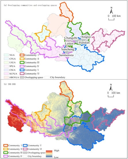 Two: the SLPA model was used to divide the Yellow River Basin into six community spaces, three of which produced overlapping spaces, i.e., Community III and Community IV produced overlapping spaces in Linfen, Community III and Community V produced overlapping spaces in the cities of Changzhi, Handan, and Xingtai, and Community IV and Community V produced overlapping spaces in Yuncheng and Sanmenxia.